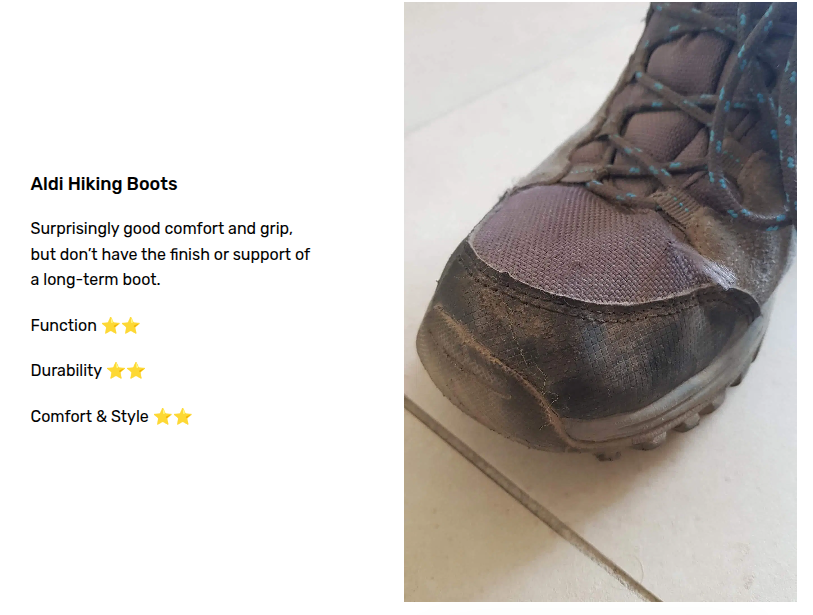 La gran alpinista @miranda_cfittock nos comenta en un gran artículo donde hace revisión de toda la gama de montaña que se vende en el Aldi que la sensación de las botas es buena y que la suela tiene un buen agarre. Casi nadie le va a dar el trote que le pueden dar alpinistas de esta categoría. Por nuestra parte, pensamos que este tipo de botas y calzado de senderismo puede ser una opción muy buena para senderistas ocasionales e incluso como calzado de repuesto para senderistas profesionales debido a su bajo costo y a su buena relación calidad-precio.